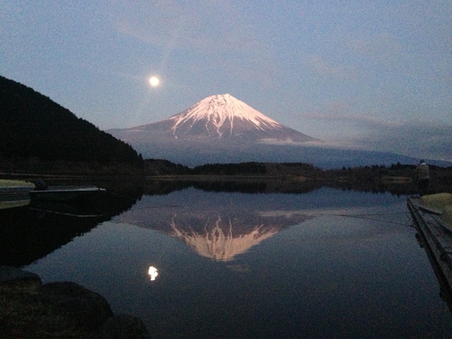 湖面が鏡のように静まり返る瞬間、富士山がくっきりと映り込む。